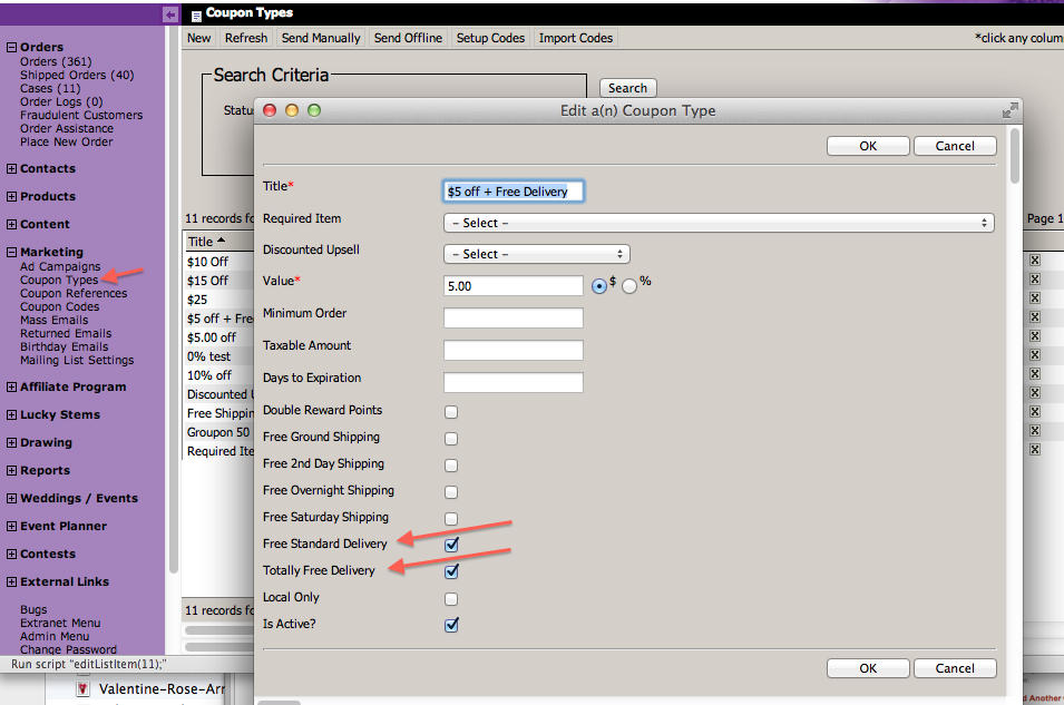 If you select Free Standard Delivery then only the Base Delivery Fee will be removed. Any Up-charge Dates, Up-charge Zip Codes, Affiliate or Campaign Fees will still be added. Because of this we’ve added a Charge Details hover element that shows on the Cart Review screen when you hover over the “Delivery / Service Charges” line on the order. This will show “Delivered FREE!” (or whatever you have in your Store Settings for Delivered Text) and then list any of the other up charges there, including Rush Delivery if they choose that. This means that if you have selected the “Combine Affiliate Fees” so that any Affiliate / Campaign Fees normally get combined into the delivery fee, we will now be displaying them as separate items on the Cart Review page because there is no delivery fee, this will only happen if they have added a Free Standard Delivery coupon, otherwise it still combines them on the Charge Details hover element. This way the user knows the Free Standard Delivery coupon worked because they see “FREE” there, but they’ll see the details of what, if any, additional charges there are for Up-charge Dates, Up-charge Zips, Affiliate and/or Campaign Fees and Rush Delivery.
