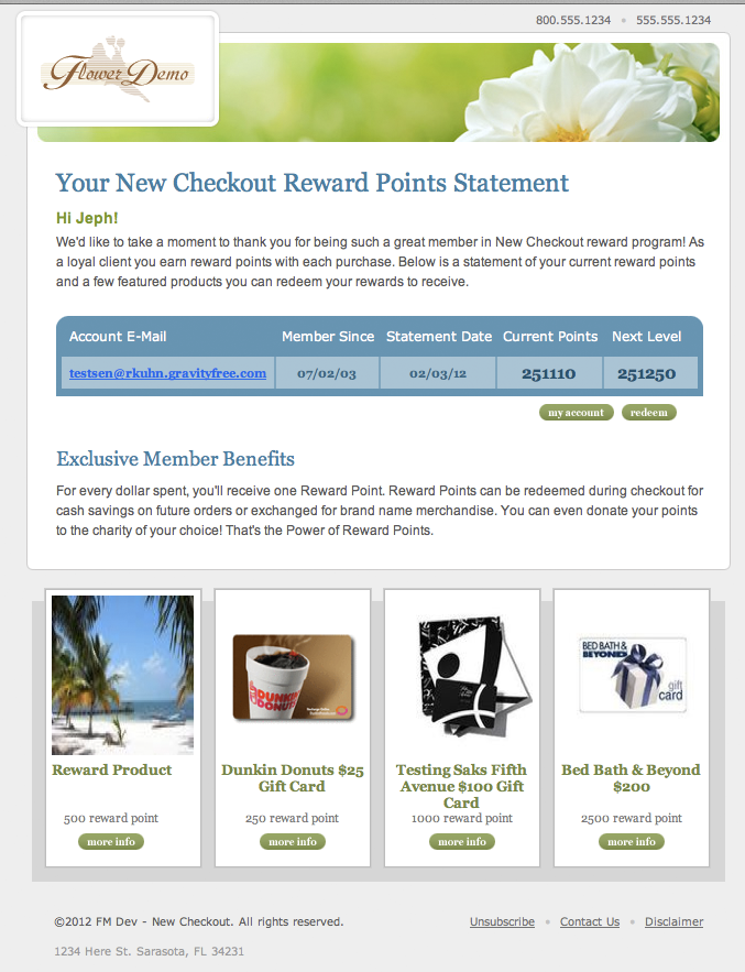 We’ve added a new Reward Statement 2012 template to the Mass Mailers to replace the older Reward Statement mailer. When creating the mailer you may select 4 Reward Products (f you select less than 4 none will appear in the mailer) to include in the email to help sell the Rewards program. This a much more modern version of the Reward Statement mailer with a layout that renders better across mail clients and is no longer tied to the site theme. This compliments the Product Modern template we released last year to replace the Product template.