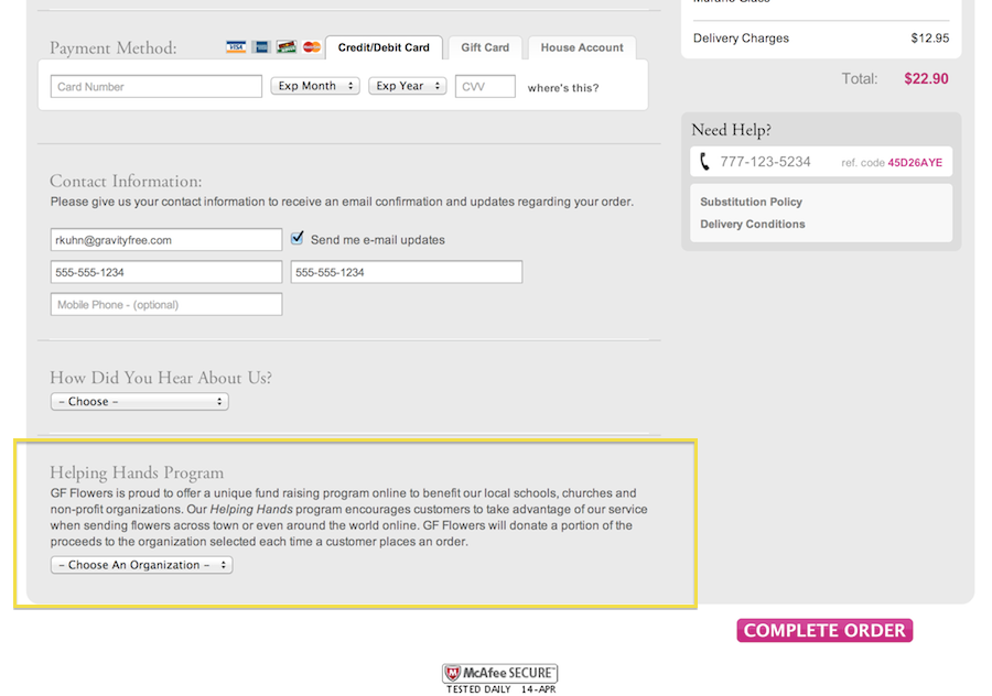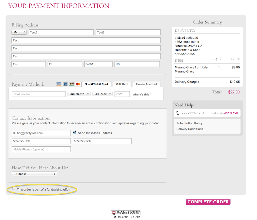 We altered the checkout billing page so that the Charity Organization is not as prominent. There is now just a checkbox to indicate the order is part of a fundraising effort. If the user checks that box it presents them with the same Charity Organization section that was there before.